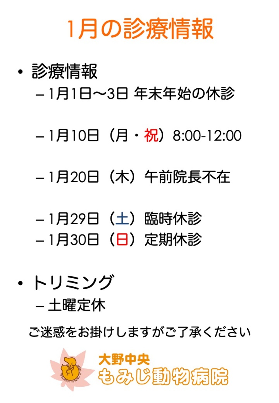 1月20日(木)は午前中は院長が不在のため診察ができません(トリミング、フード、予防薬の継続など対応可能です)、午後は通常診療です。ご迷惑をお掛けしますがご了承下さい。