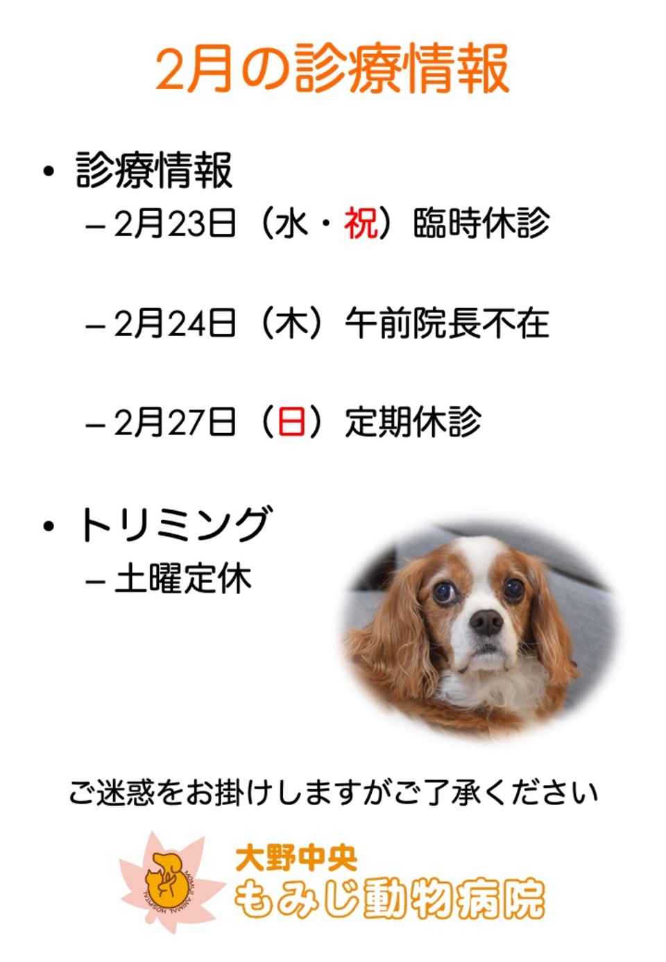2月24日(木)は午前中は院長が不在のため診察ができません(トリミング、フード、予防薬の継続など対応可能です)、午後は通常診療です。ご迷惑をお掛けしますがご了承下さい。