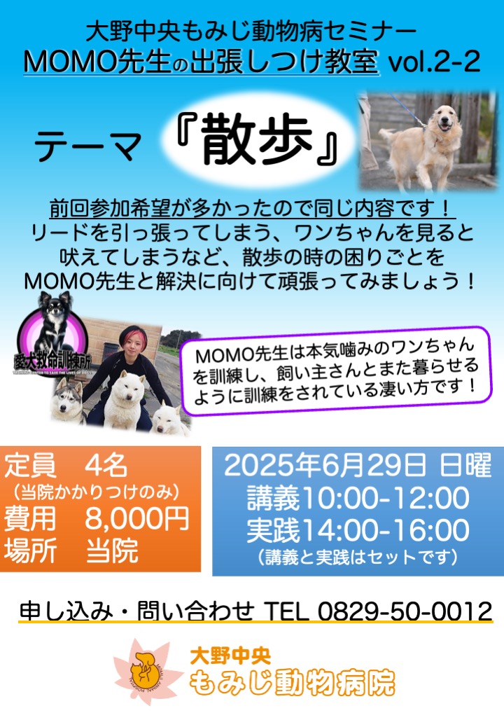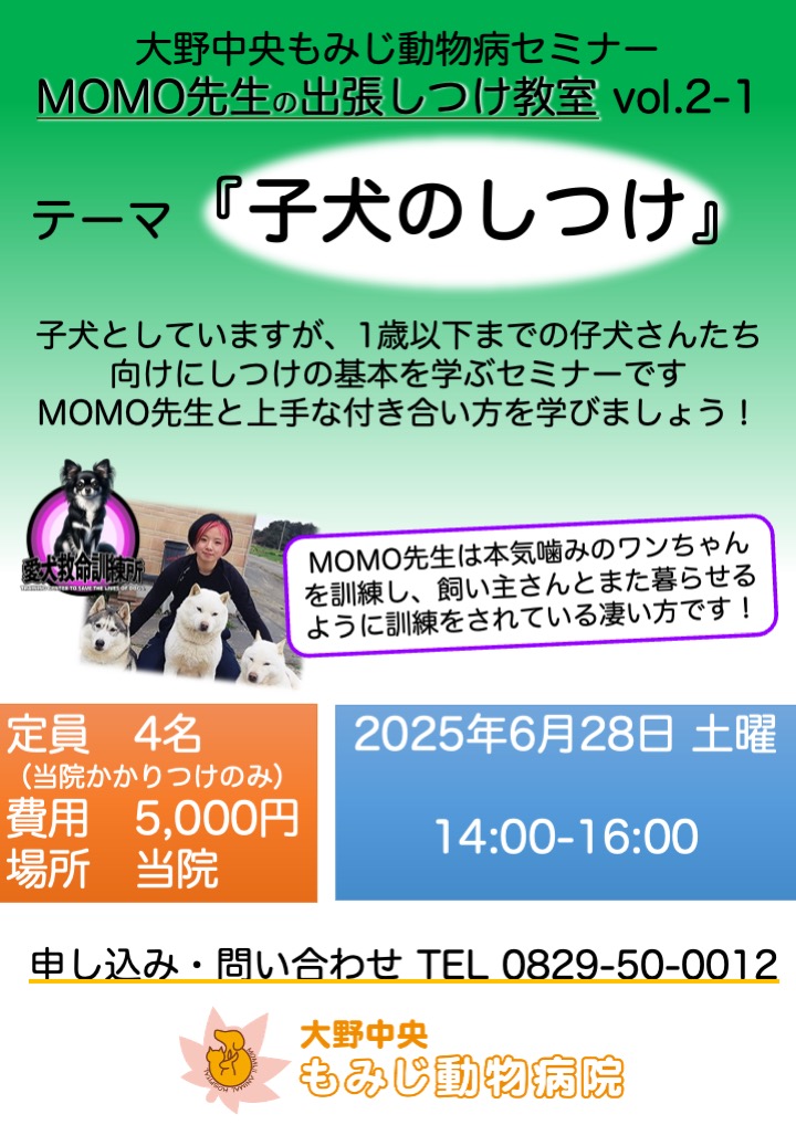 開業当初から「しつけ」について相談を受けることも多く、知識と自分自身の経験などから精一杯お伝えはしてきたつもりですが、より実践的なセミナーをずっと開催してきたいと思っていました!ただ、自分が思うような先生を見つけられませんでした。今回、MOMO先生がされていたセミナーに参加しお話を聞くなかで理論、考え方などが自分が思っていたこと・やりたかったことに近いと感じお願いしました。正直、セミナーの主催はしたこともなく、いろいろと格好の悪いセミナーになってしまうかもしれません。それでも先生が伝えてくれる中身だけは今後のワンちゃんとのハッピーライフを過ごす上で参加していただいた方に大きな財産となると思います。正直、病院としての採算性はありません。それでも犬との生活で困っている方がヒントを得て、犬との今後の生活がよりよいものになって欲しいと思い企画しました。上手く行けばシリーズセミナーにしたいと思っています。取り上げてほしいテーマなどあれば教えて下さい!