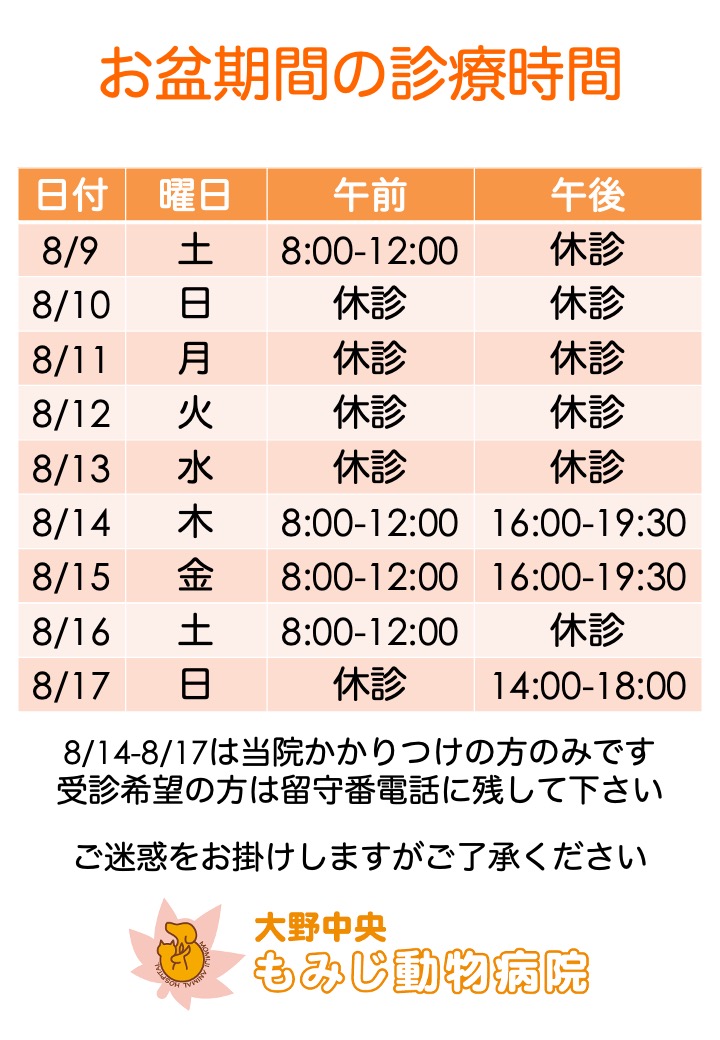 お盆休み期間(10-13日)は時間外対応もできません、急な体調不良の場合は他院もしくは広島夜間救急動物病院受診をご検討下さい。